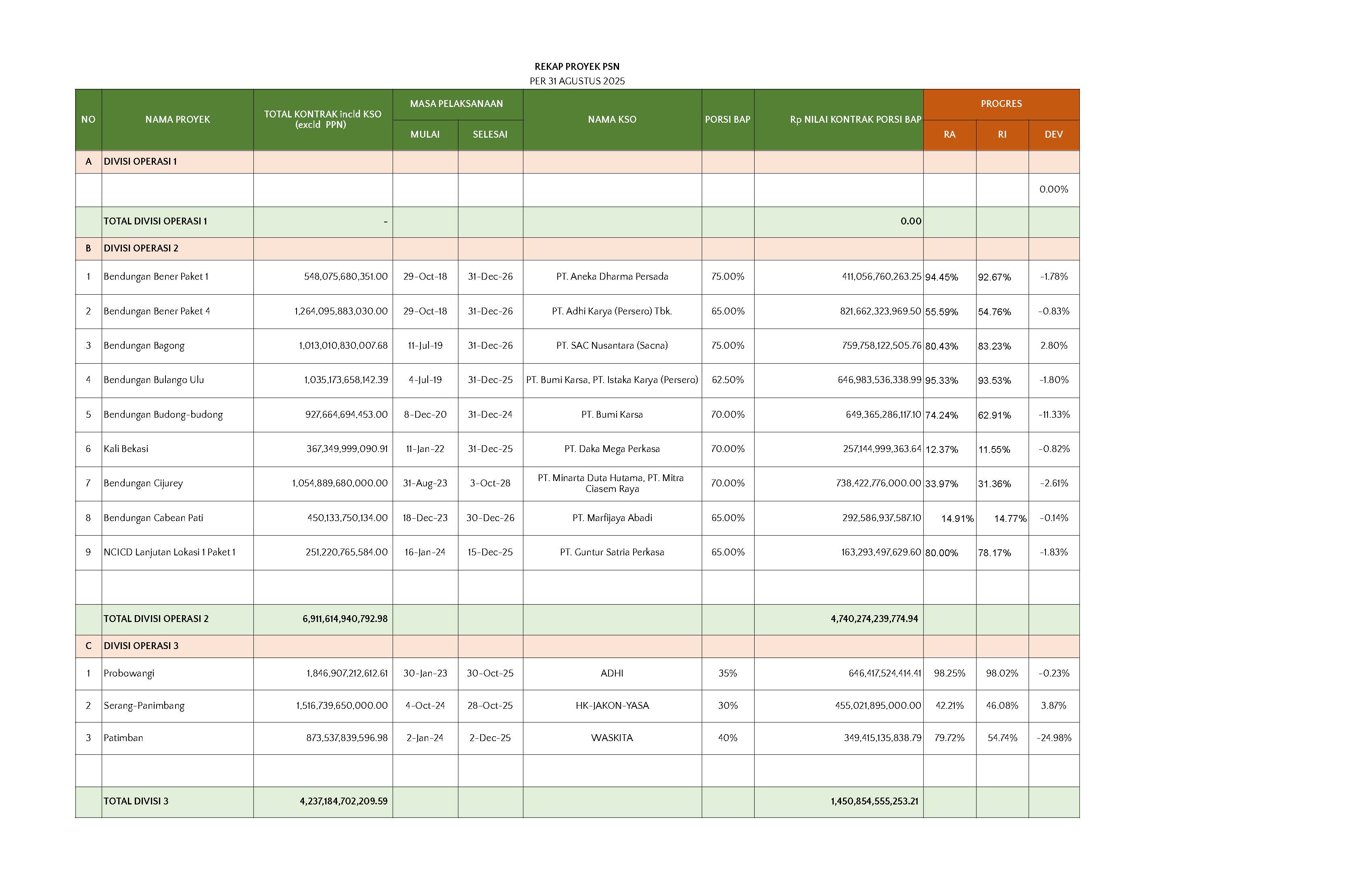 PT Brantas Abipraya (Persero) memiliki lini bisnis yang cukup lengkap di sektor konstruksi. Adapun lini bisnis Perseroan antara lain Bendungan, Irigasi, Terowongan, Reklamasi, Jalan/Jembatan, Bandara, Gedung, Mekanikal & elektrikal, Pembangkit listrik, serta precast dan peralatan yang terbentuk menjadi empat divisi. Melalui kinerja lini bisnisnya, hingga kini Abipraya telah banyak dipercaya untuk mengerjakan proyek strategis pemerintah.